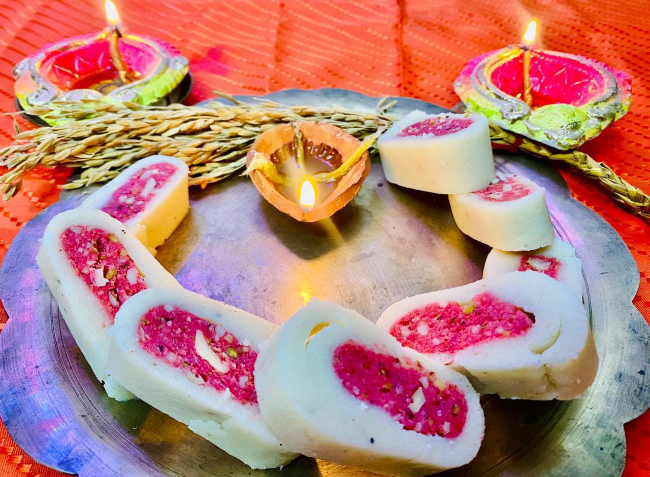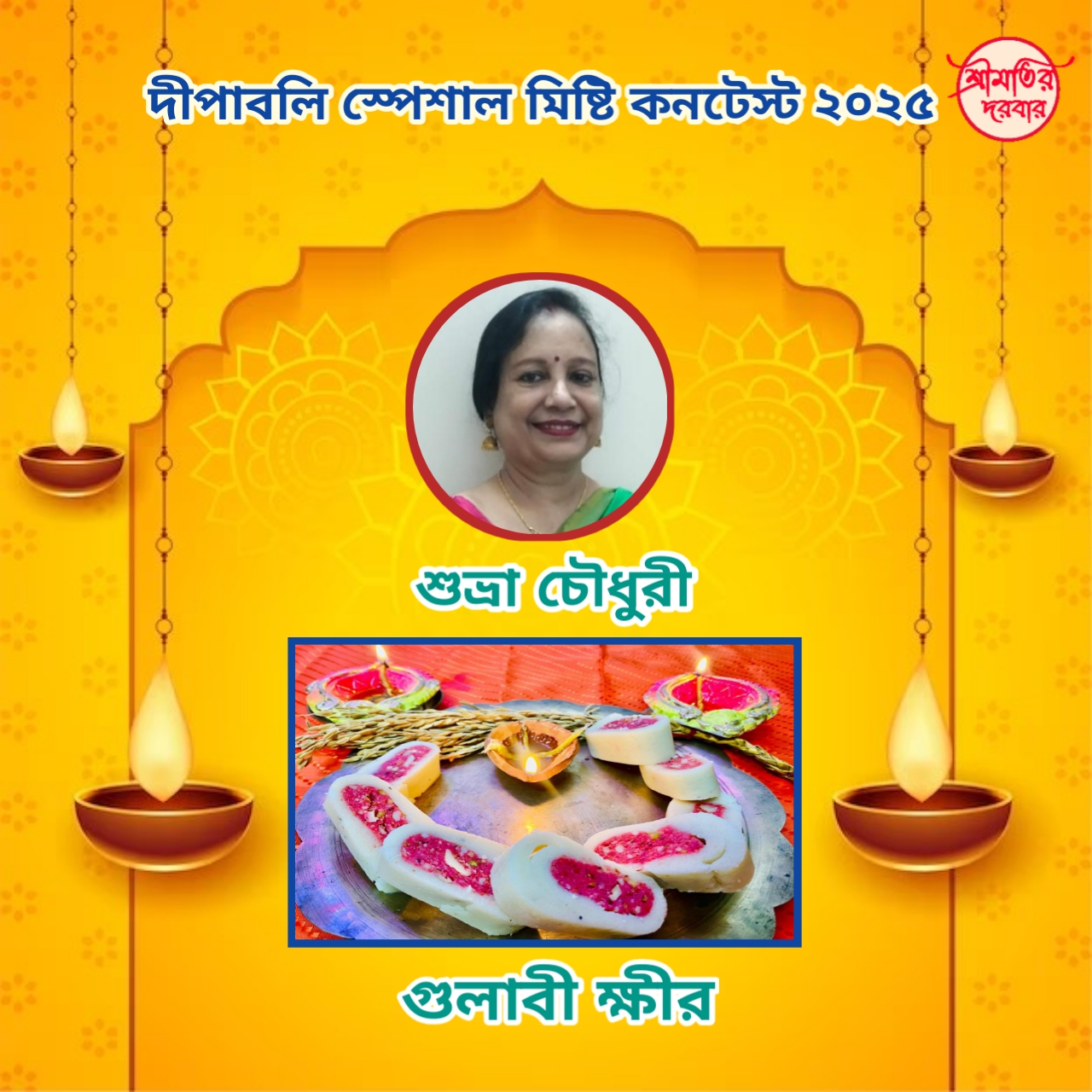 প্রনালী:- প্রথমে একটা পাত্রে ড্রাই ফ্রুটস ছাড়া সব উপকরণ একসঙ্গে মিশিয়ে নিয়ে একটা মন্ড তৈরি করতে হবে।এবারে মন্ডটির একটা বড় অংশ থেকে ছোটো করে লেচি কেটে নিতে হবে। বড়ো লেচিটিকে গোল করে বেলে নিতে হবে। এবারে ছোটো লেচির মধ্যে ড্রাই ফ্রুটস ও রোজ এসেন্স দিয়ে ভালো করে মেখে একটা সুন্দর রোল করে বড়ো করে রুটির মতো করে বেলে রাখার মধ্যে দিয়ে আবারো সুন্দর করে দুটো একসাথে রোল করে নিতে হবে। এইভাবে দশ থেকে পনেরো মিনিট ফ্রিজে রাখতে হবে। পনেরো মিনিট পরে ফ্রিজ থেকে বের করে রাউন্ড শেপ করে কেটে নিতে হবে। তারপর সুন্দর ভাবে সাজিয়ে পরিবেশন করতে হবে। এইভাবে তৈরি হবে গুলাবী ক্ষীর এটা চার থেকে পাঁচ দিন রেখে খাওয়া যেতে পারে।