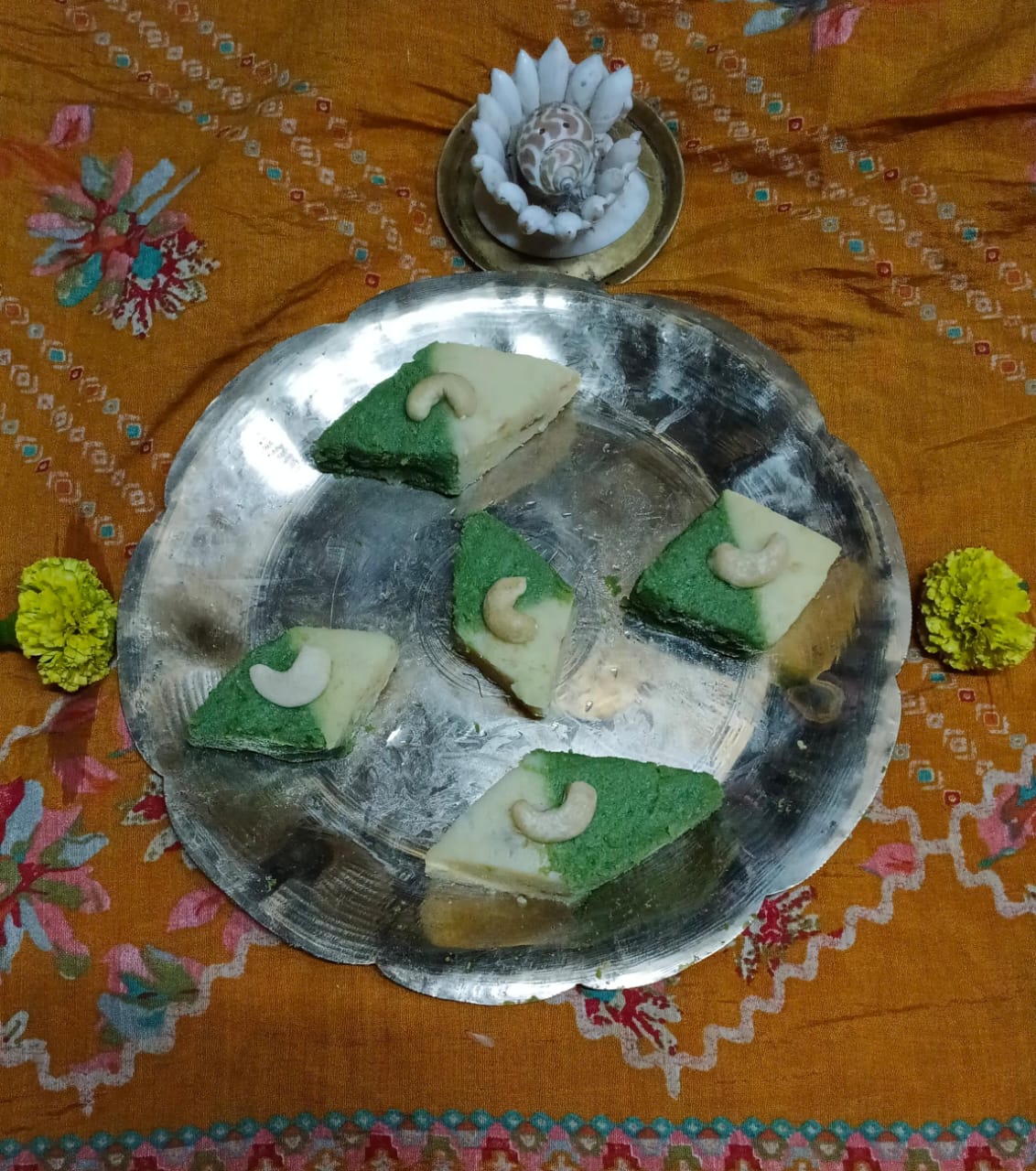 এবারে সবুজ অংশর জন্য আগের পদ্ধতিতেই দুধ ঘন করে গুঁড়ো দুধ মিশিয়ে আরও ঘন করে তাতে চিনি মিশিয়ে মটর শুটি আর ধনেপাতার মিশ্রণটা মিশিয়ে পাক দিয়ে ঘন একটা মন্ড বানিয়ে নিতে হবে। ঠিক আগেরবারের মতোই থালাতে ঘি ব্রাশ করে মণ্ডটা ঠান্ডা করে ফ্রিজে রেখে দিতে হবে। এটা ক্ষীর মালাই সন্দেশ তাই খেয়াল রাখতে হবে দুটো রঙের পাক ই যেনো খুব শক্ত না হয়ে যায়। এক ঘন্টা বাদে ফ্রিজ থেকে বার করে দুটো অংশ মিশিয়ে ত্রিভুজের আকৃতি দিয়ে উপর থেকে একটা কাজুবাদাম লাগিয়ে সুন্দর করে সাজিয়ে পরিবেশন করতে হবে।