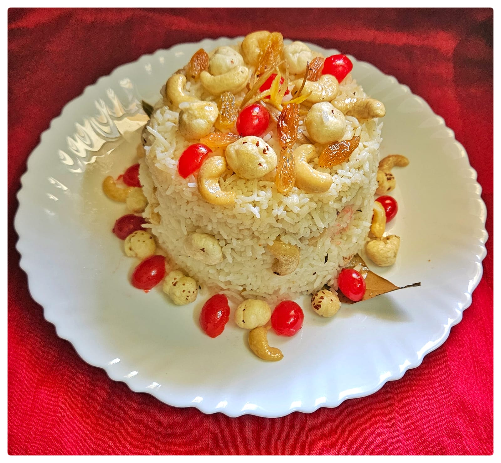 প্রনালী:- প্রথমে চাল ধুয়ে ৩০মিনিট জলে ভিজিয়ে রাখতে হবে। তারপর জল ঝরিয়ে নিতে হবে। এরপর কড়াইতে সাদা তেল ও ১চামচ ঘি দিয়ে গরম হলে একে একে মাখনা,কাজু ও কিশমিশ ভেজে তুলে রাখতে হবে।আদাও ভেজে তুলে রাখতে হবে। এবার ওই তেলেই গোটা গরম মশলা, তেজপাতা , কাঁচা লঙ্কা ফোড়ণ দিতে হবে। ফোড়ণের সুগন্ধ বেড়োলে জল ঝরানো চাল দিয়ে ভাজতে হবে।চালটা খুব ভালো করে ভেজে নিয়ে চালের ডাবল গরম জল দিতে হবে। টকদই টাও দিয়ে ভালো করে নেড়েচেড়ে স্বাদমতো নুন ও চিনি দিতে হবে।ফুটে গেলে গ্যাস কমিয়ে ঢাকা দিয়ে রাখতে হবে। মিনিট ১০পর ঢাকা খুলে বাদবাকি ঘি,ভাজা আদা কিছুটা, কাজুবাদাম ও কিশমিশ, খোয়া ক্ষীর,মাখনা,ঘি, গরম মশলা গুঁড়ো, জায়ফল গুঁড়ো দিয়ে ভালো করে মিশিয়ে নিয়ে ঢাকা দিয়ে ৫মিনিট রেখে নামিয়ে নিয়ে