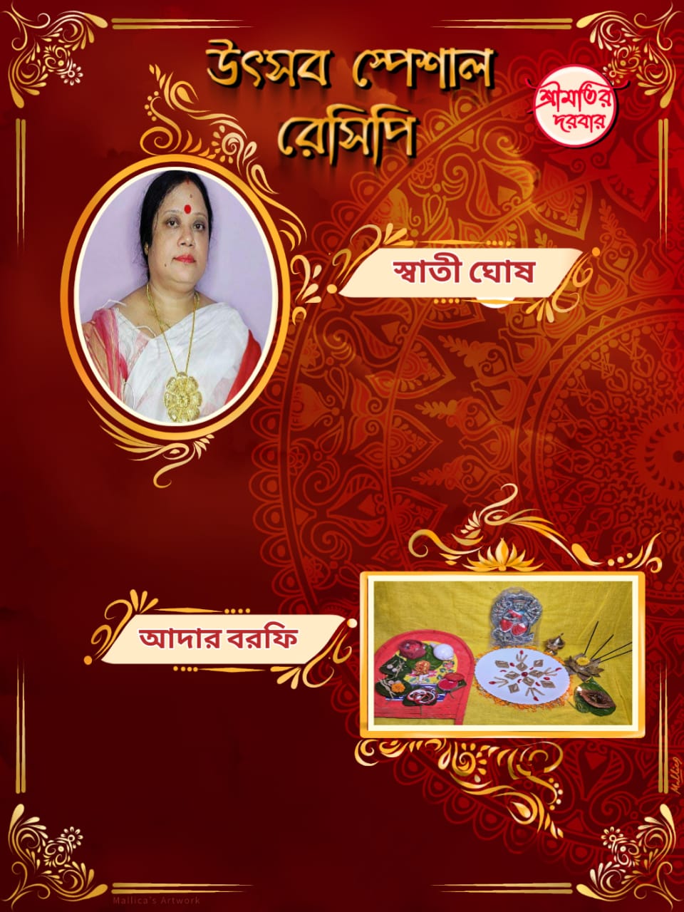 প্রনালী:- প্রথমে আদা গ্রেট করে নিতে হবে।আমন্ড পেষ্ট করে নিতে হবে।এবার কড়াইতে ঘি দিয়ে আদাটা ভাজতে হবে। তারপর আমন্ড পেষ্ট দিয়ে নেড়ে চেড়ে খোয়া ক্ষীর গ্রেটকরে দিতে হবে। চিনি ও দিতে হবে।আবারও একটু নেড়ে চেড়ে কনডেন্সড মিল্ক দিয়ে ভালো করে মিশিয়ে নিতে হবে।বড় এলাচ গুঁড়ো দিয়ে খুব ভালো করে মিশিয়ে নিয়ে মন্ডটা যখন কড়াই থেকে ছেড়ে আসবে তখন নামিয়ে নিয়ে একটা থালায় ঘি মাখিয়ে ঢেলে দিয়ে সমান করে নিতে হবে। এরপর দারচিনি বরফির আকারে কেটে উপরে আমন্ড বাদাম দিয়ে সাজিয়ে পরিবেশন করতে হবে।